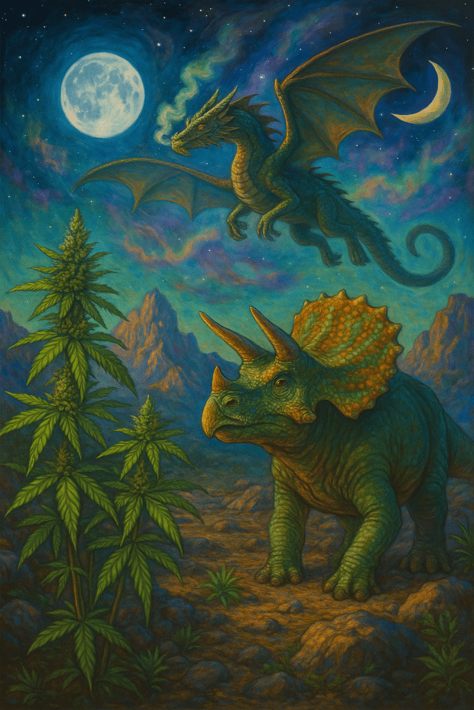 The Chronicles of Trichoteratops (now available in rolling paper form) describe the journey of the Enlightened Herd. Before the Greening of their Mind ascension, they encoded a message into the plant’s terpene profile — a sequence which, when decoded during a solar eclipse, reveals the coordinates for their return.