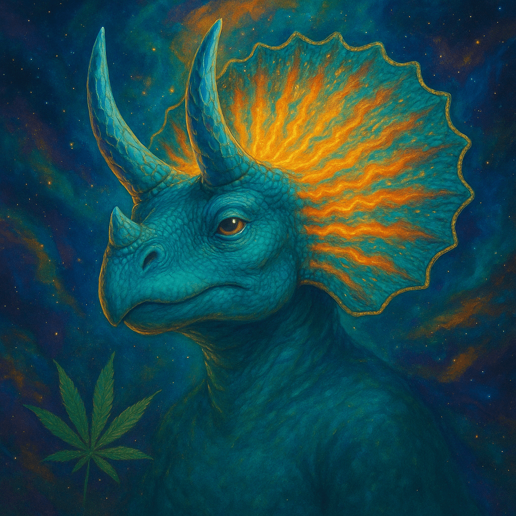 Trichoteratops was the first to ingest the THC-Rex strain and experience the “Greening.” After witnessing visions of the incoming asteroid and interstellar escape, she led the Enlightened Herd to construct the mind-formed cocoons for space travel. She can still be seen in the orbit of ZED-420b during solar eclipses, wings shimmering with terpene-infused light. Her frill is said to resonate with solar flares.